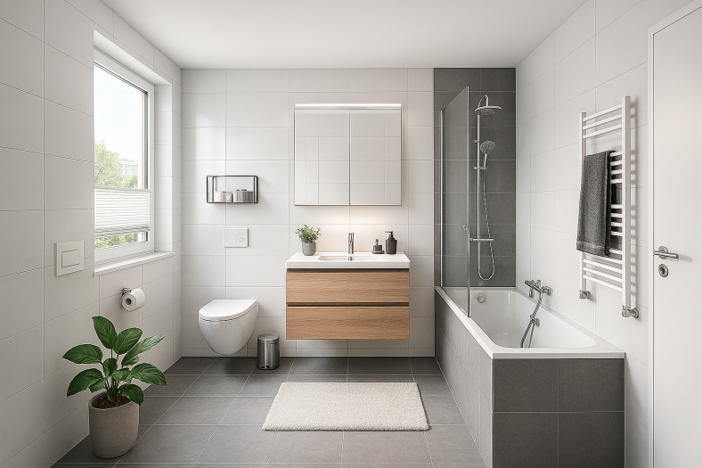 Das unmittelbar neben dem Schlafzimmer liegende Tageslichtbad bietet Platz für eine bequeme Walk-In-Dusche, ein WC. Hochwertige Sanitärkeramik, Armaturen und Fliesen entsprechen modernen Anforderungen hinsichtlich Komfort und Design.
